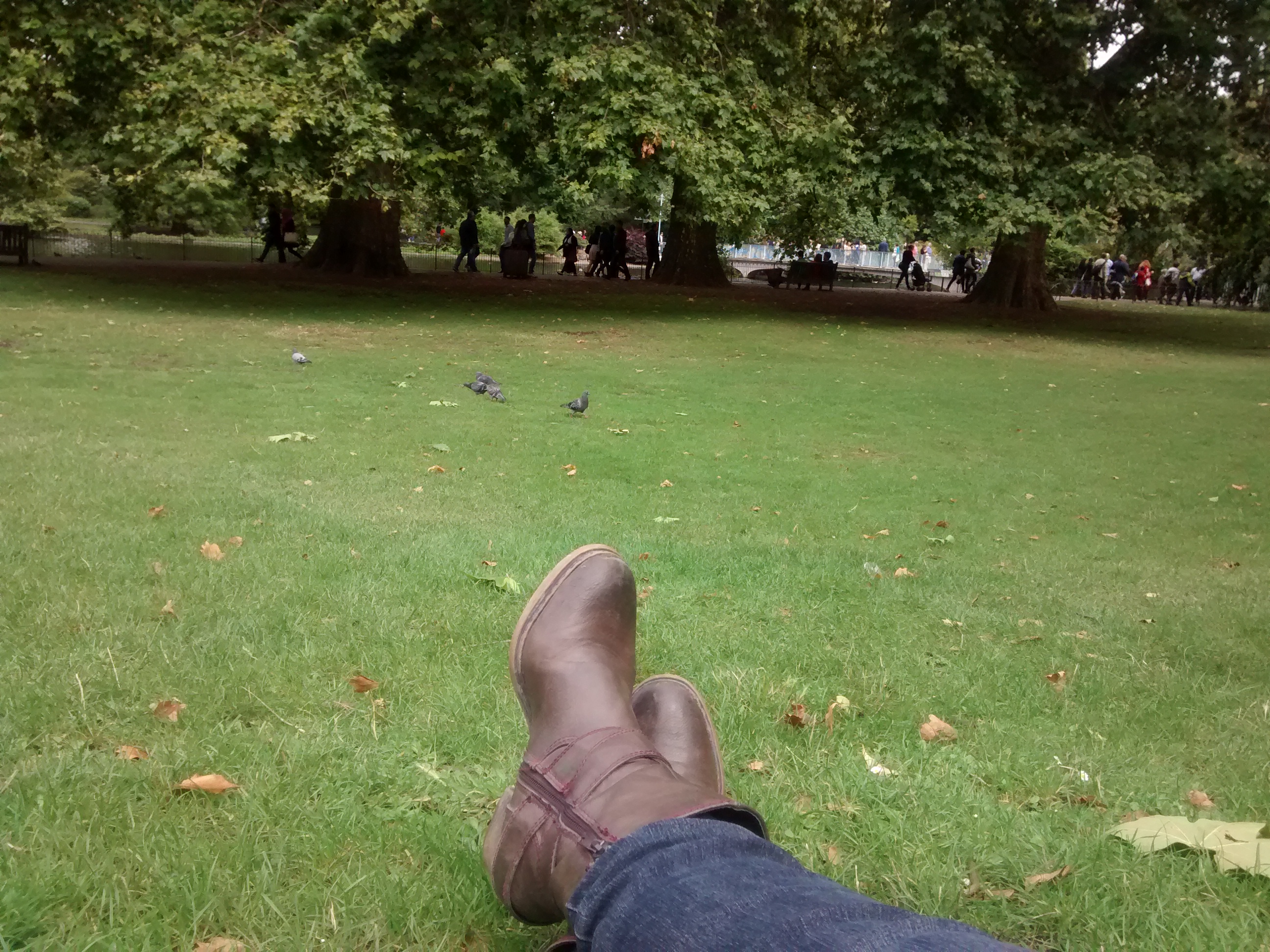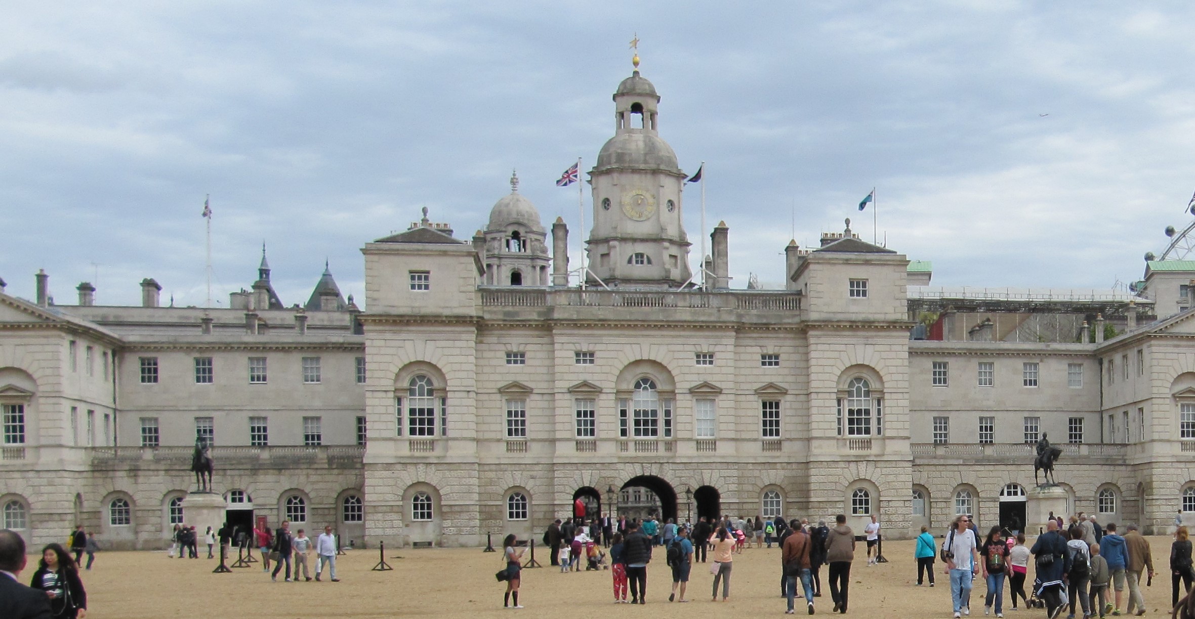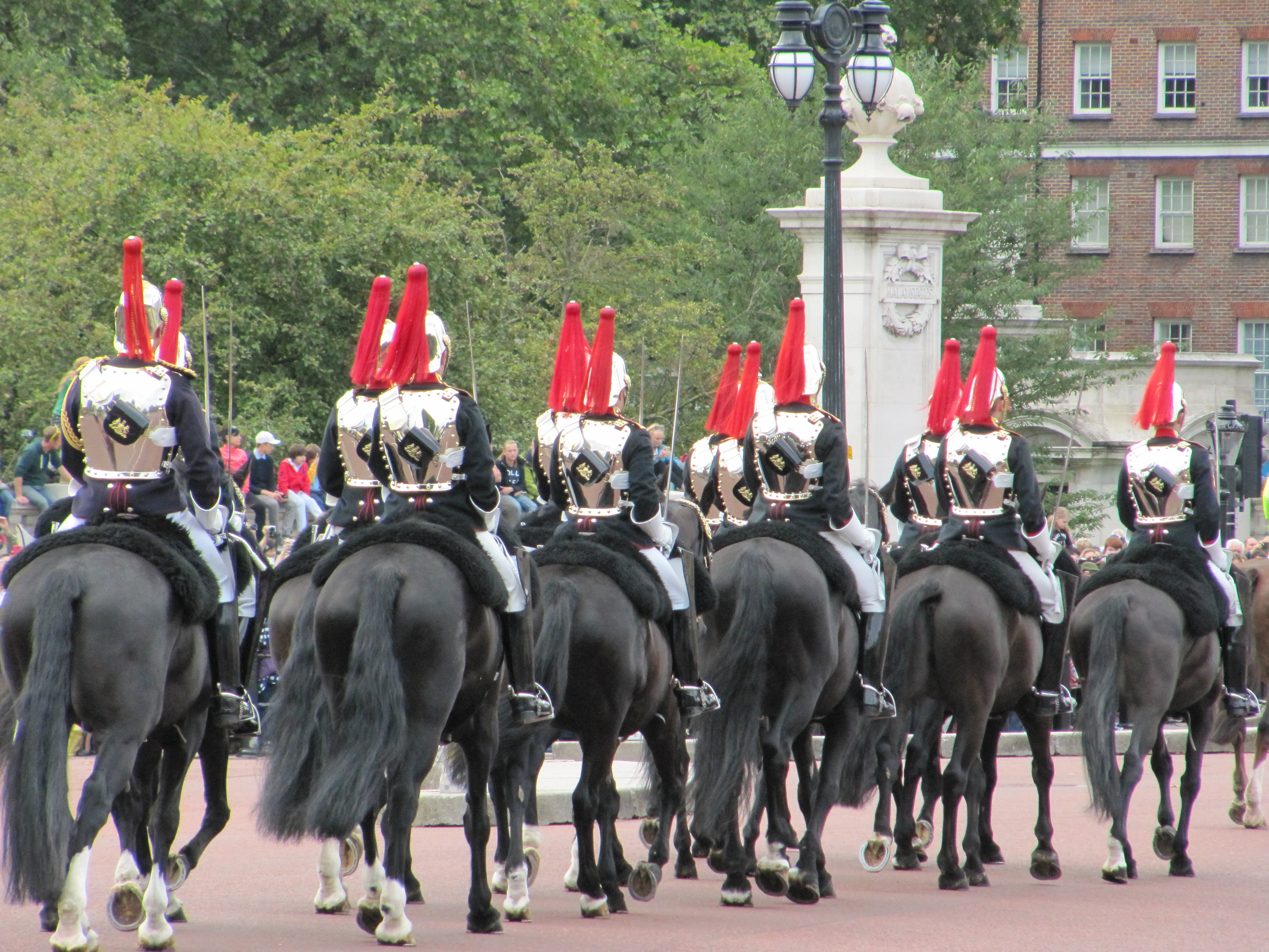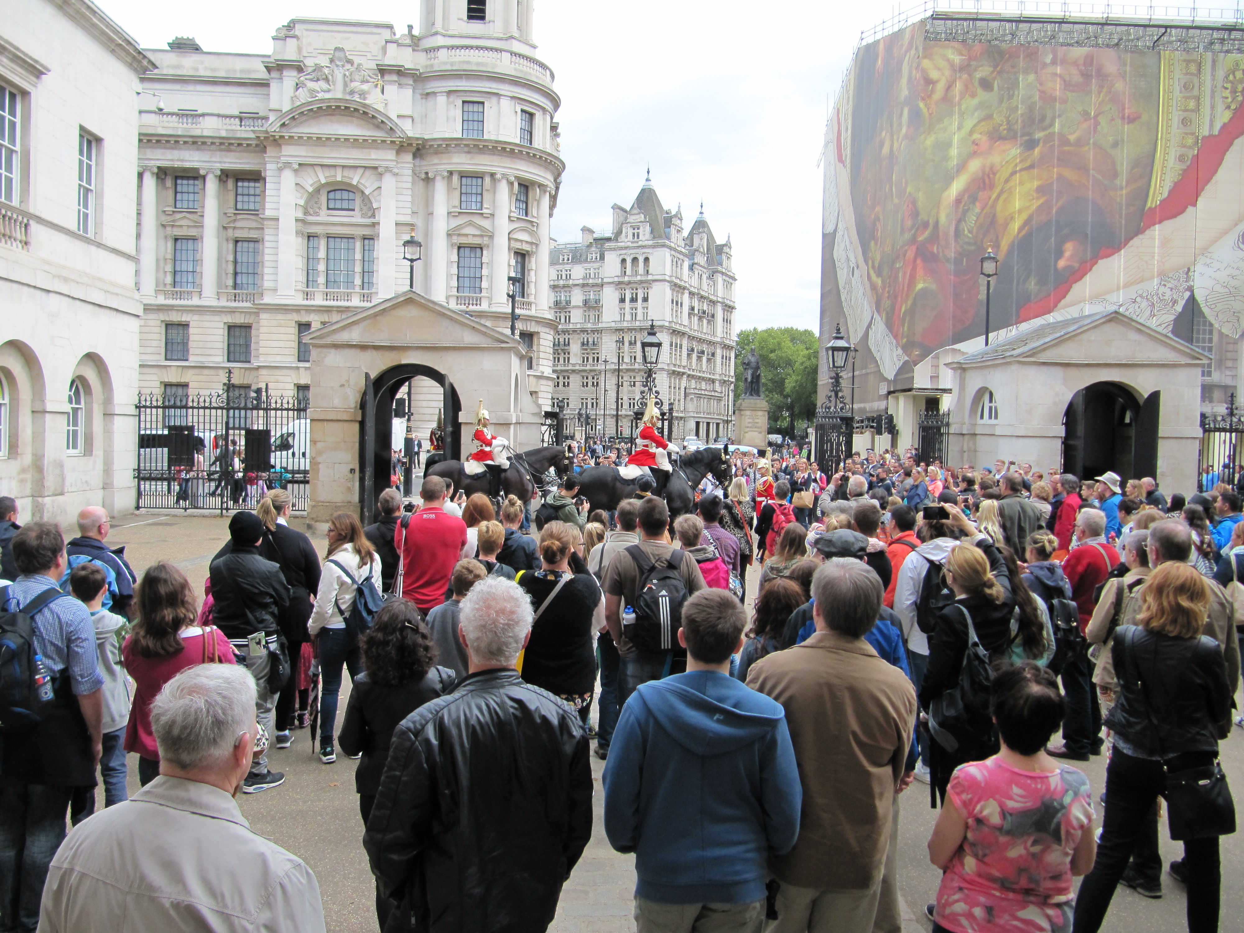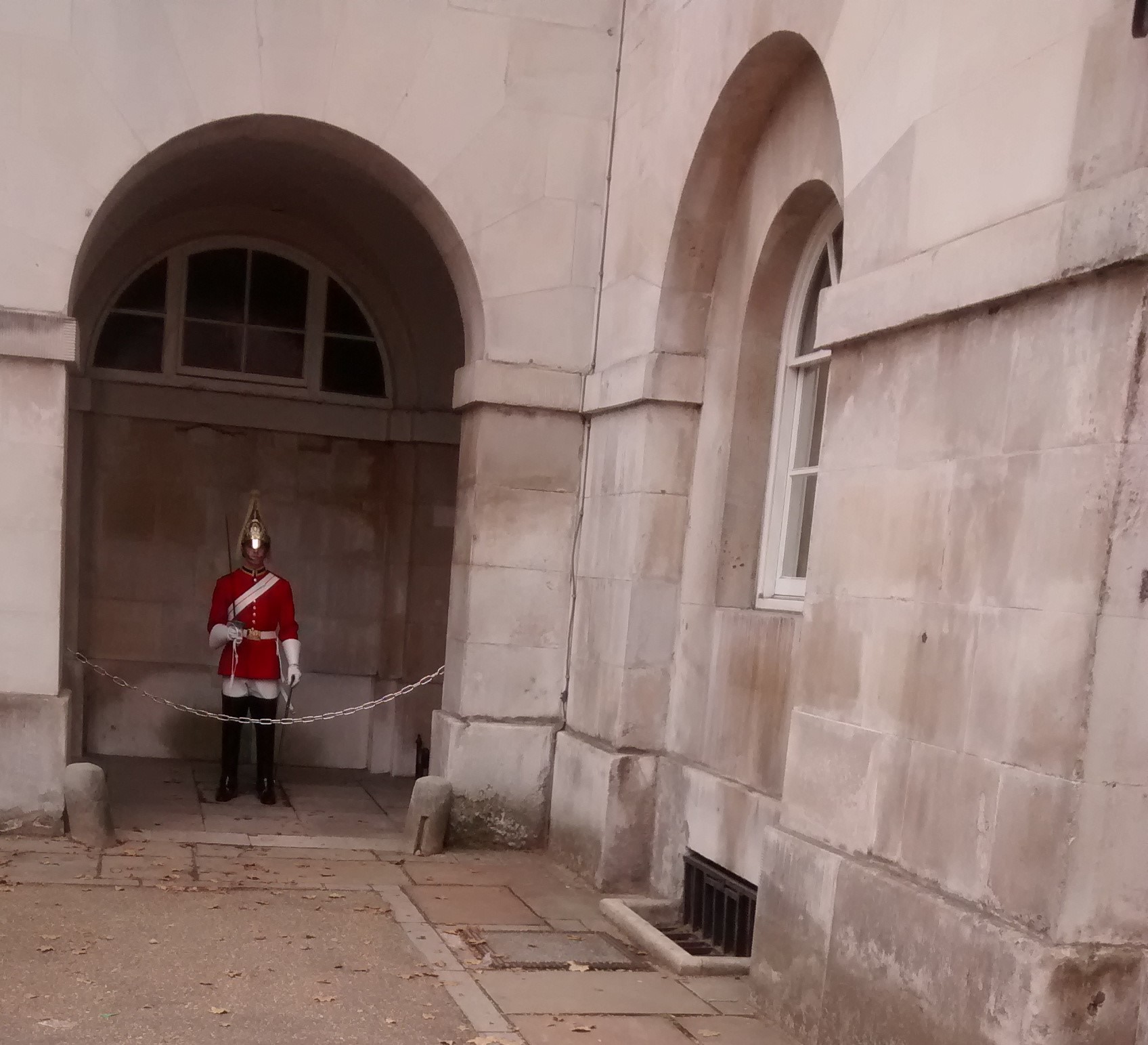 Curiosidad: mientras estábamos en el parque, oímos voces de la Guardia Real, estaban haciendo un cambio de guardia en los barracones Wellington (Wellington Baracks), así que cruzamos Bridcage Walk y lo pudimos ver en primera fila, no había nadie, empezó a venir la gente después (consejo: luego nos hemos enterado que el cambio de guardia se hace allí a las 11:30, tras el del Palacio de Buckingham). De cerca impone, no eres capaz de hacer ningún ruido por si alguno se da la vuelta y te pega un grito de esos… 😉